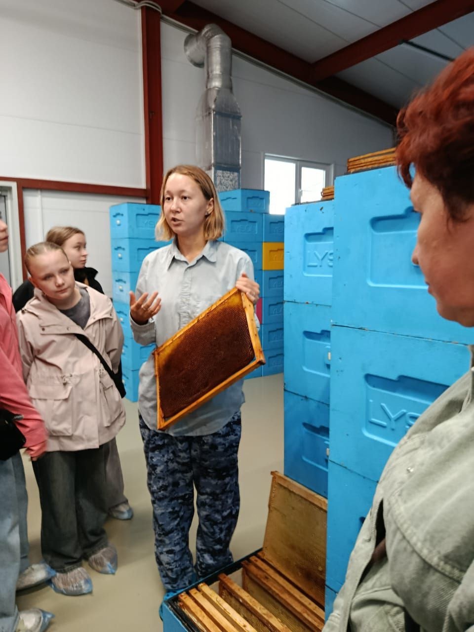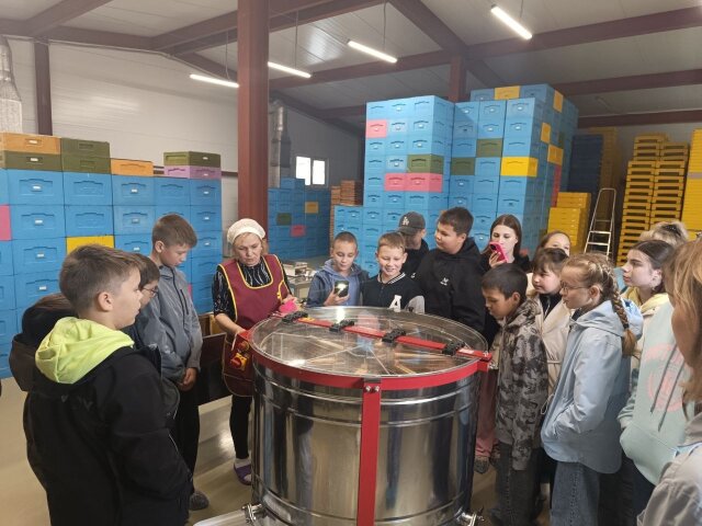 Увидели ребята, как откачивают мед. Удивило помещение, где зимой хранятся домики с пчелами. Огромная территория, обработанная, ухоженный фруктовый сад впечатляет туристов.